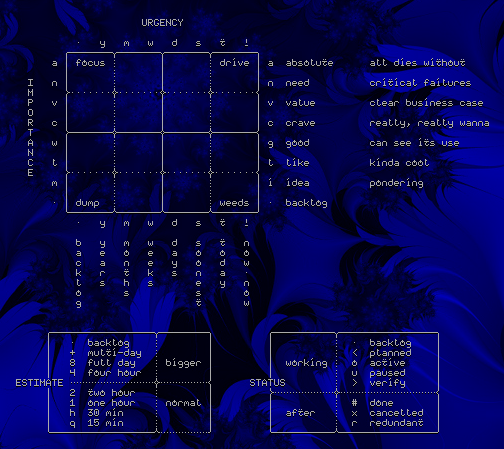 metis has four standard single character codes that help me group, sort, filter, and act on my tasks. each of those four have eight options each — maybe unnecessary symmetry, but it just organically worked out.